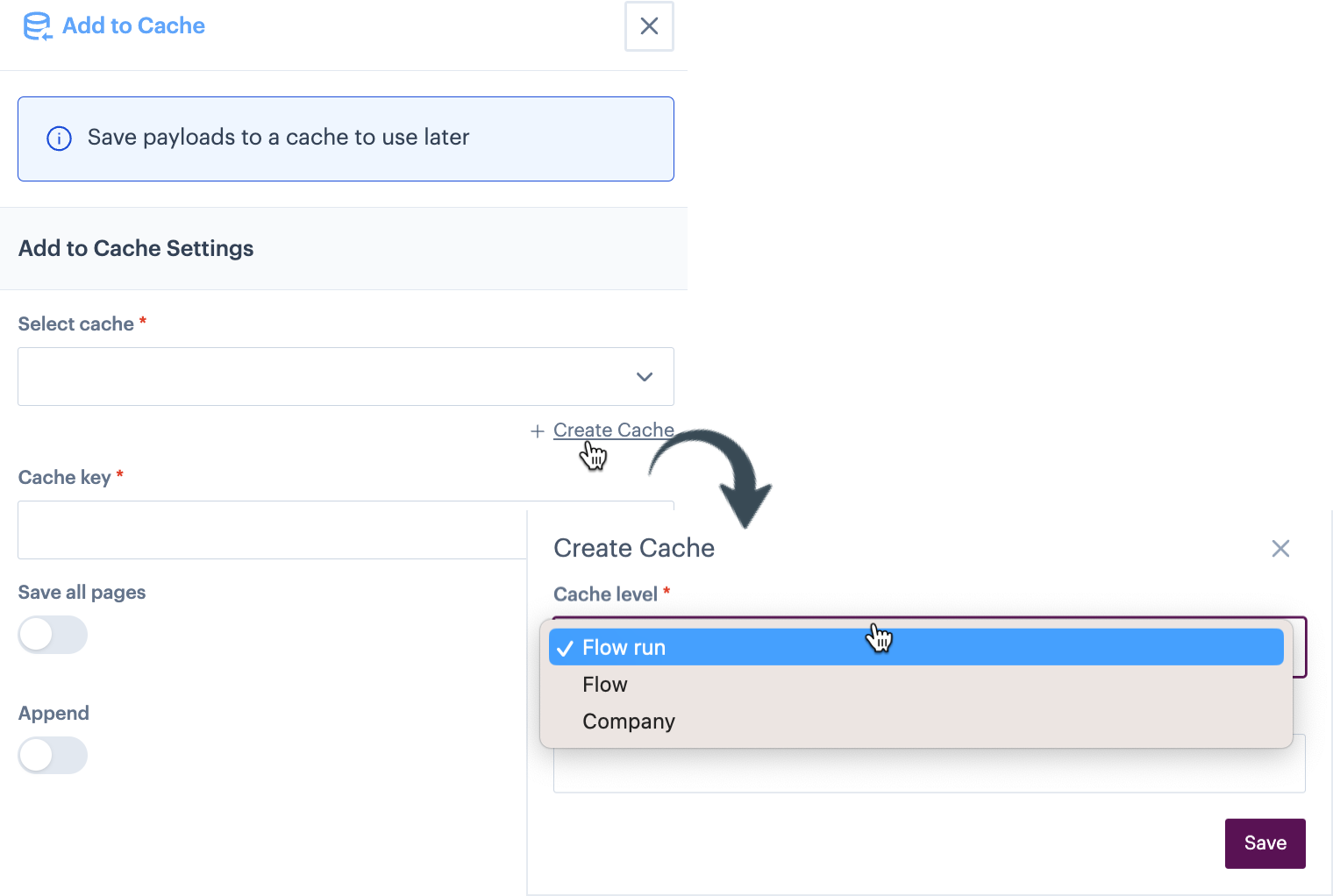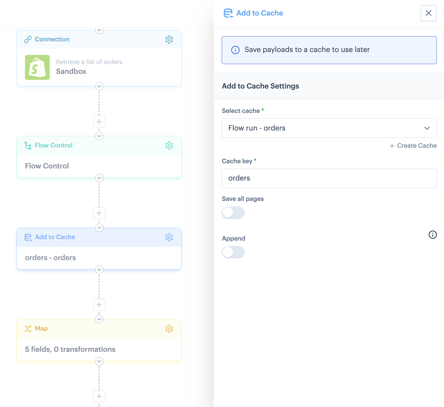 Add to cache* and Load from cache shapes can be incredibly powerful components in a process flow. Drop an Add to cache shape into your flow to store the payload at that point in time, and retrieve data later in the flow (or even in other process flows) via a Load from cache shape.