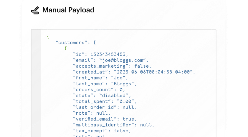 The manual payload shape in Patchworks lets you define a fixed payload for further processing. For instance, you can create an email template for an email connection or test a process flow while a connector is under development. You can access settings by clicking the 'cog' icon. To configure, simply paste the payload and save the shape. If you don't have the payload at the moment, you can enter {} and save.